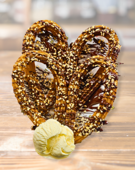Four of our signature looped churros, freshly made and coated to golden perfection, topped with your choice of sauces and finished with a scoop of creamy vanilla ice cream.